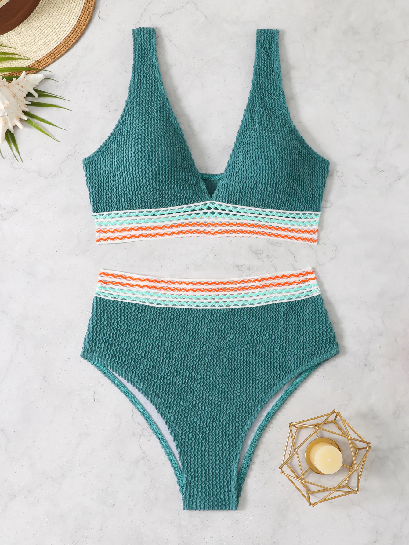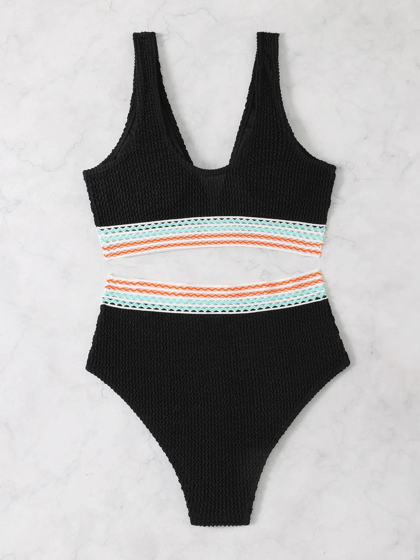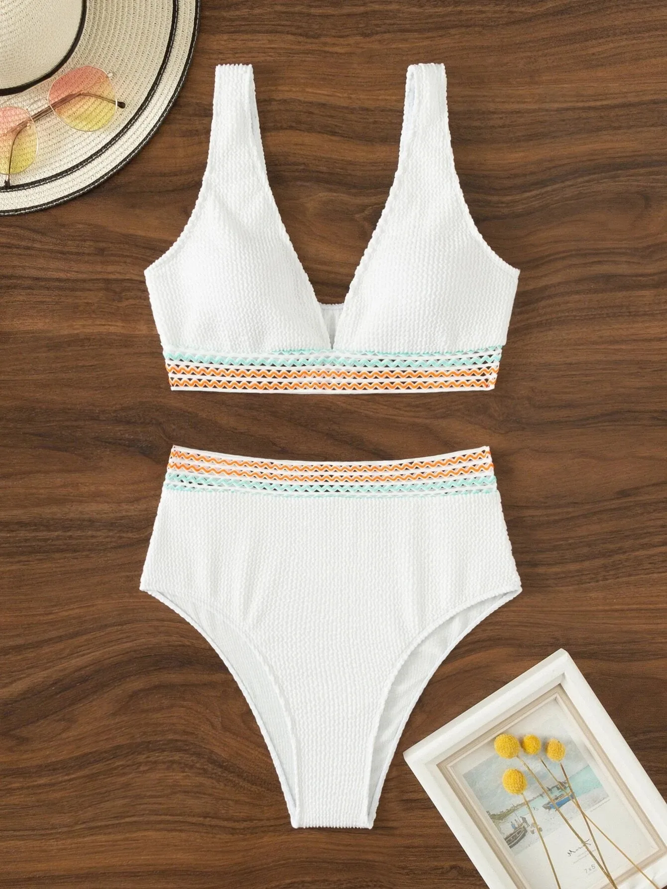 2025 Sexy Strape Tape Swimsuit Women Solid High Waist Bikini Set V-neck Swimwear Female Padded Bathing Suit Swimming Beachwear