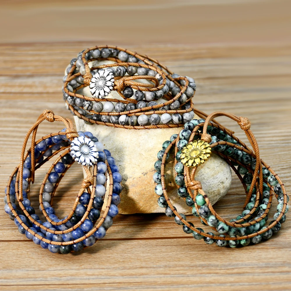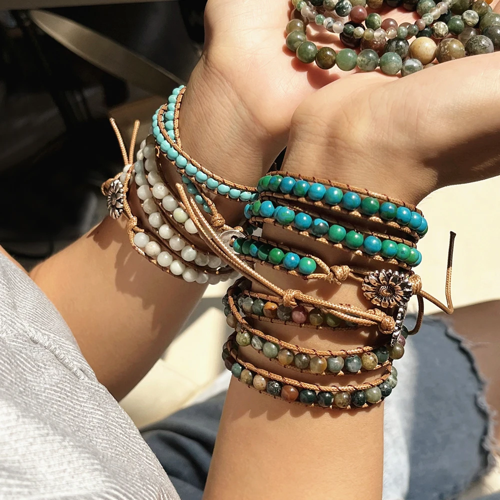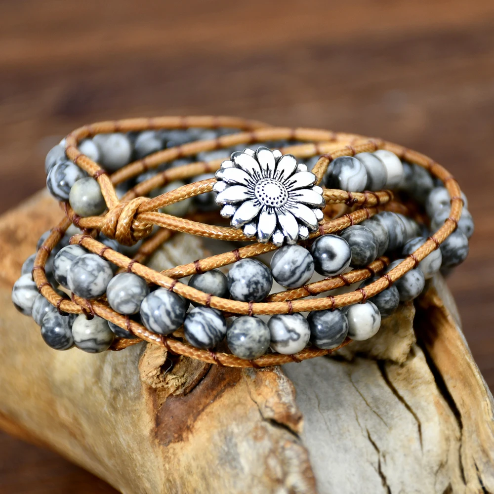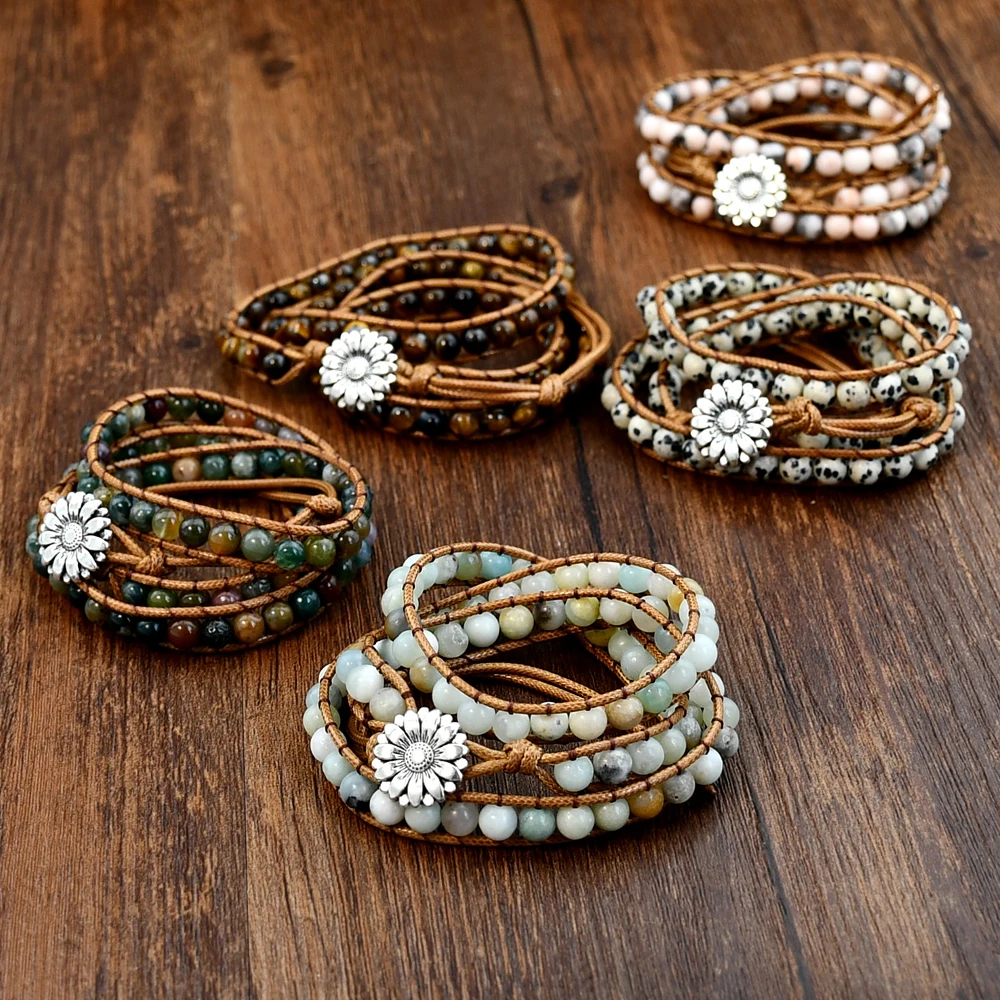 Boho Natural Stone Wrap Bracelet Leather Multilayers Colorful Jasper Agate Beaded Flower Charm Handmade Bracelets