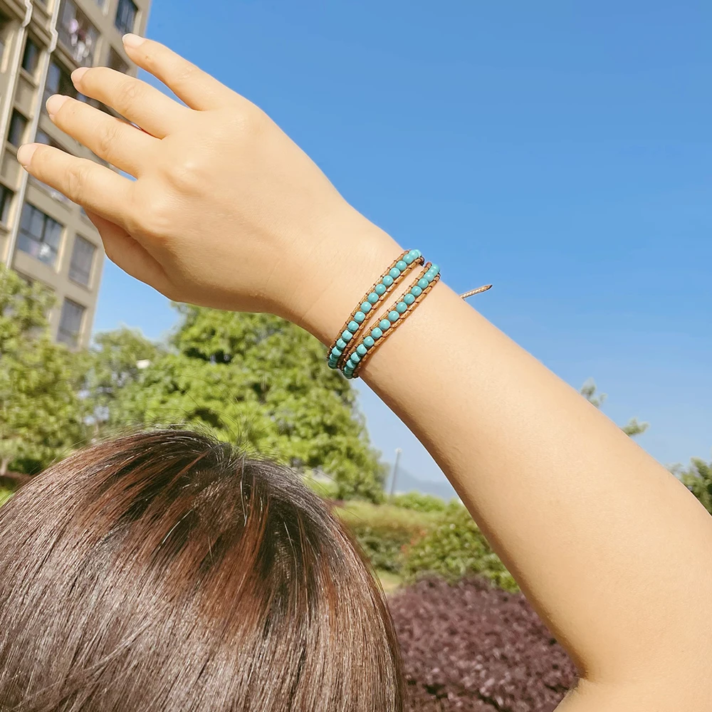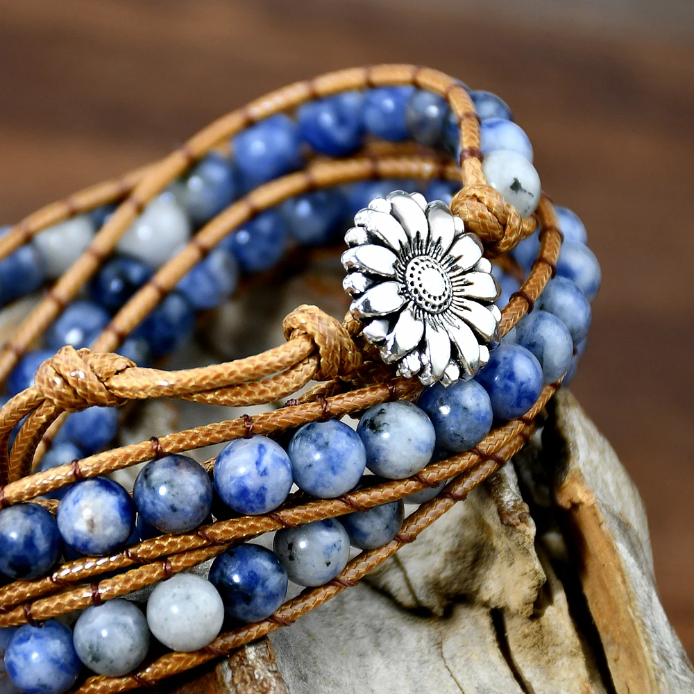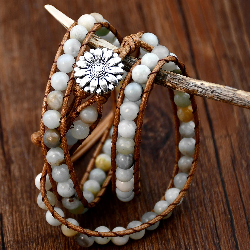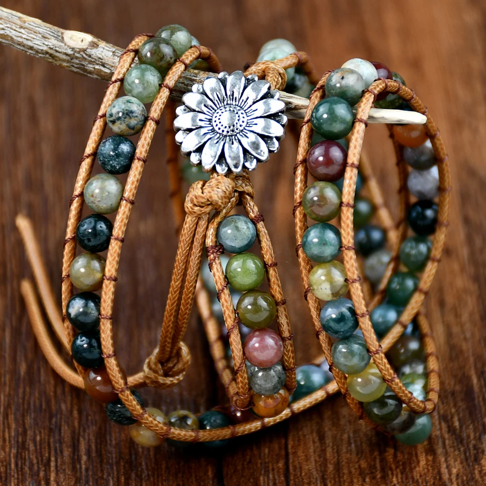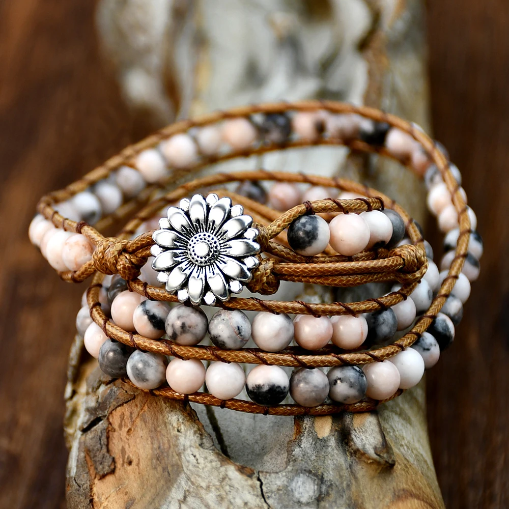 Boho Natural Stone Wrap Bracelet Leather Multilayers Colorful Jasper Agate Beaded Flower Charm Handmade Bracelets