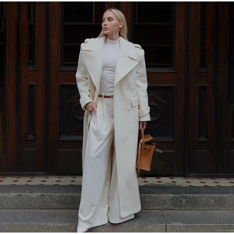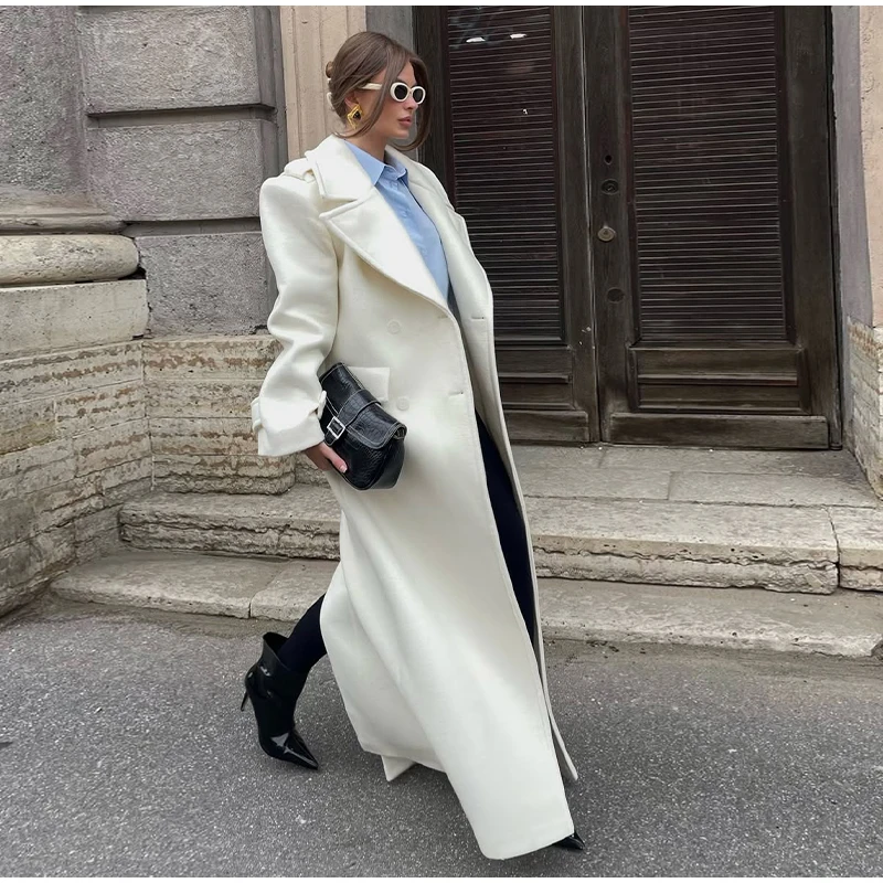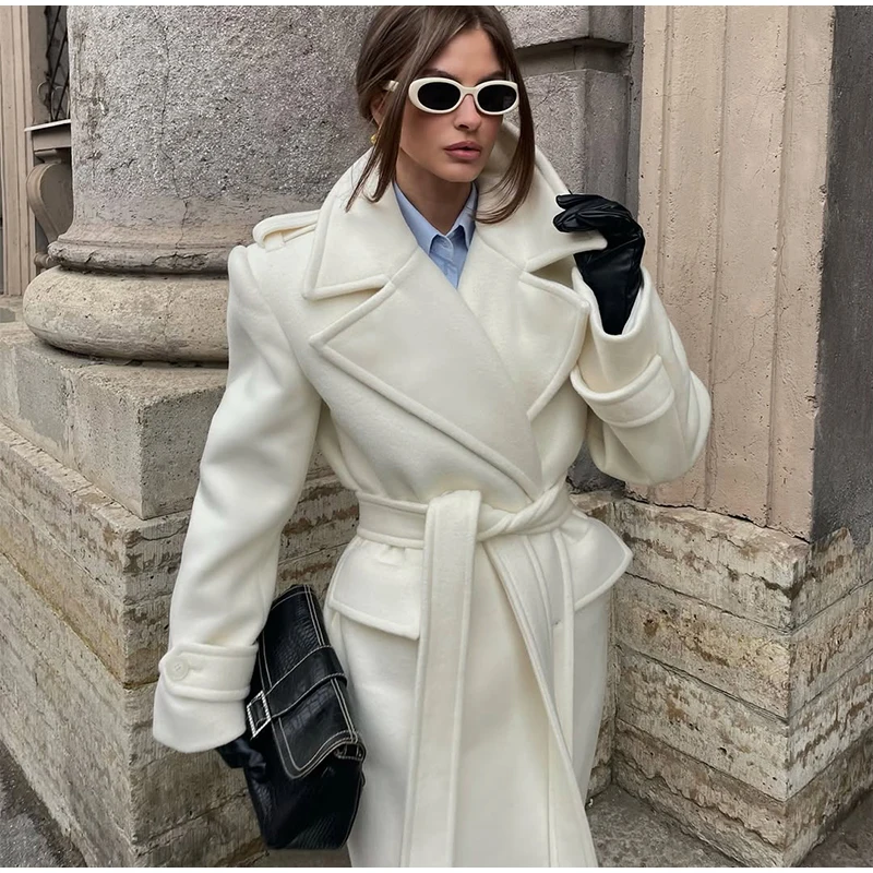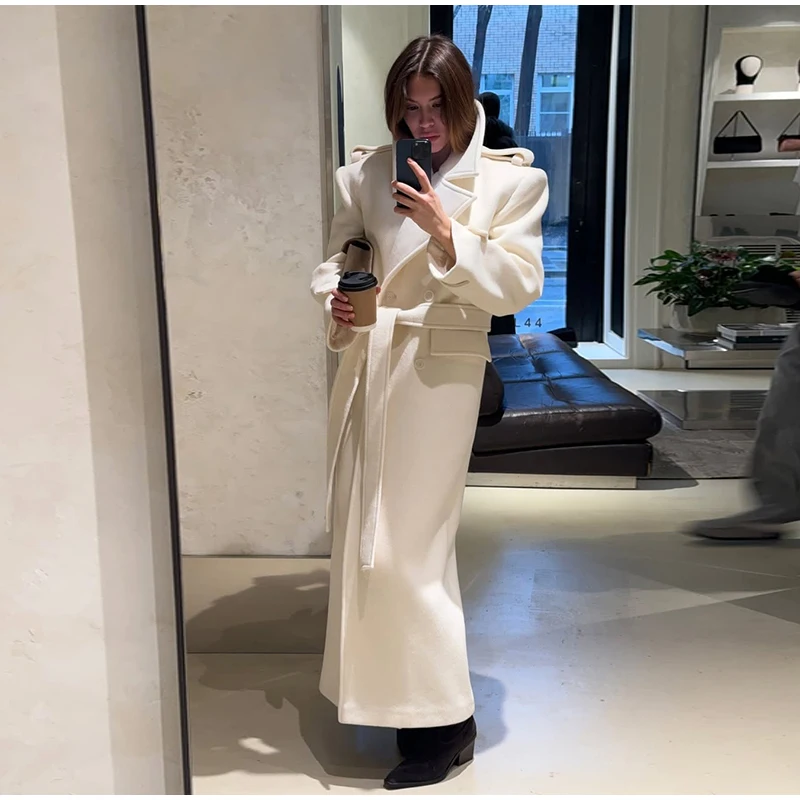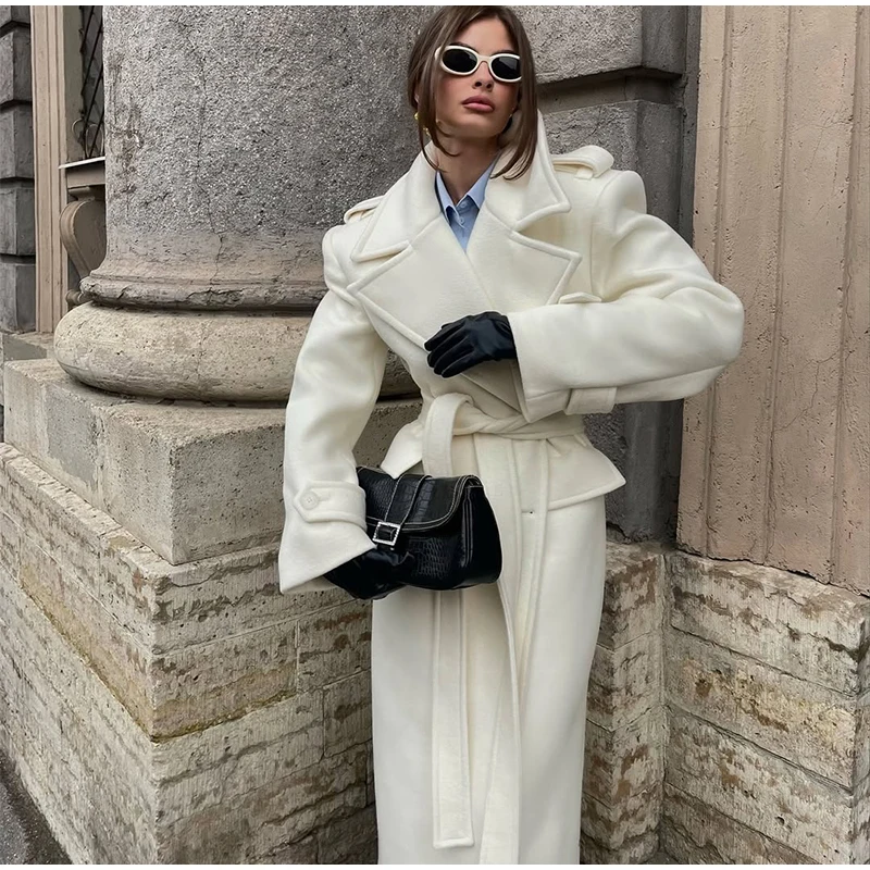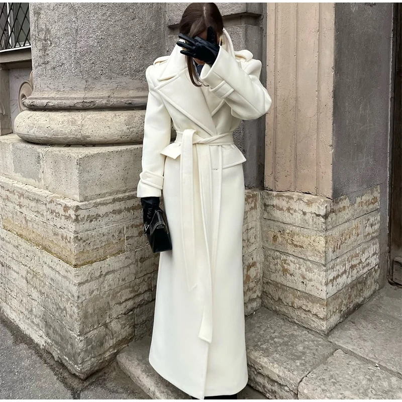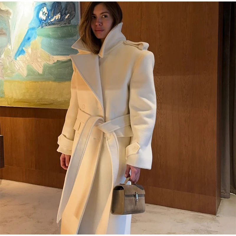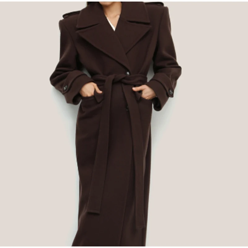 Elegant Lace Up Overcoats Women Double-breasted Wool Long Coats With Pockets 2025 High Street Fashion Autumn Winter Outerwears