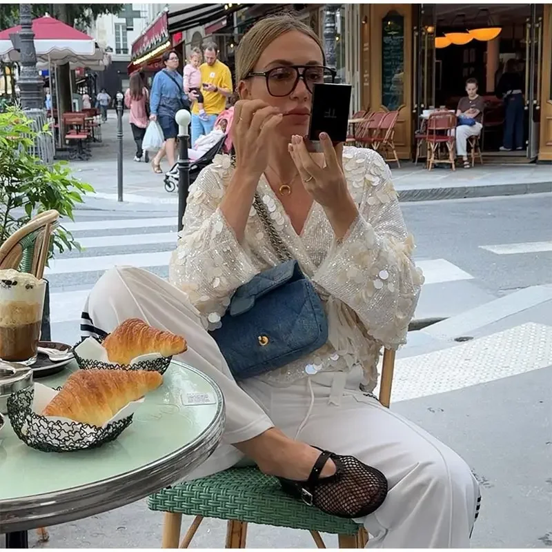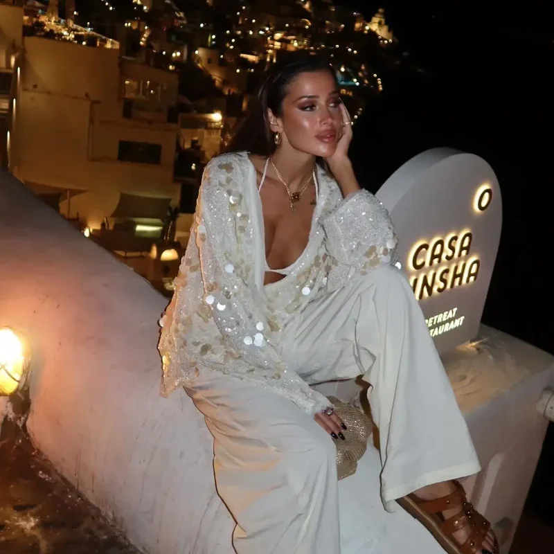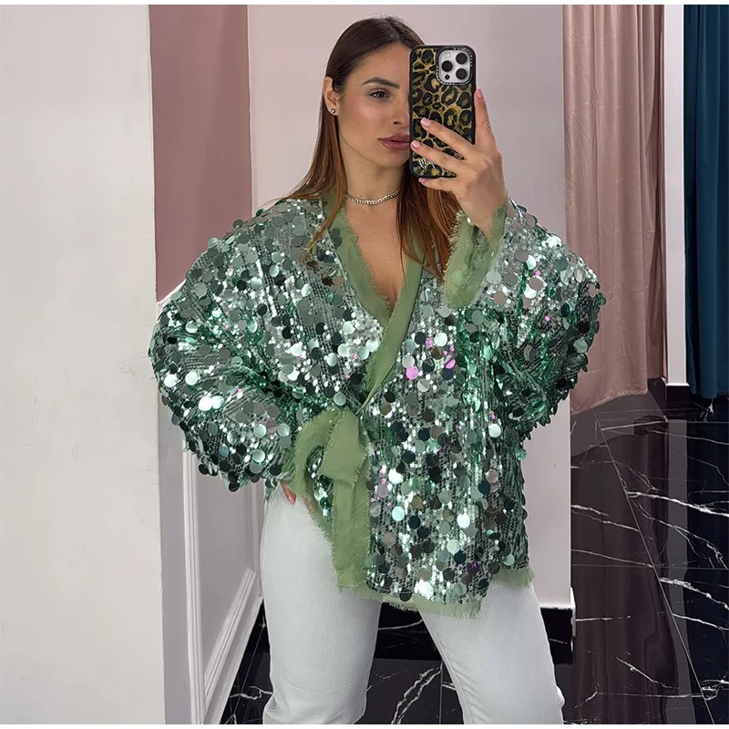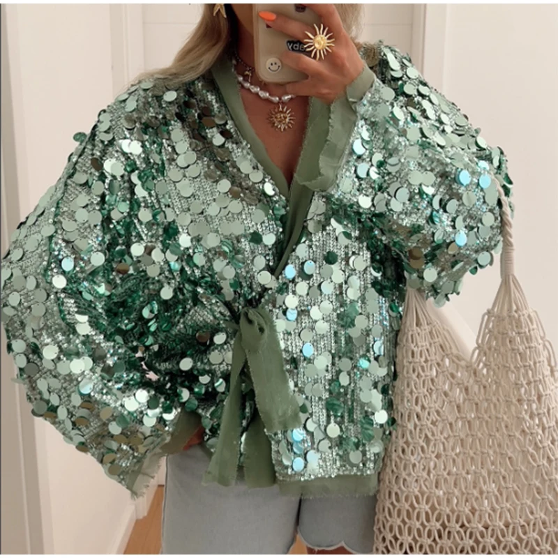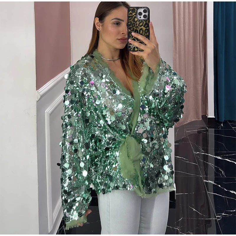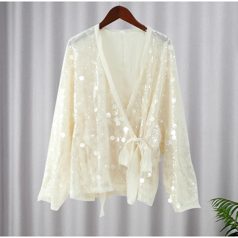 Fashion Sparkling Beaded Short Loose Jacket Elegant V Neck Long Sleeve Lace Up Cardigans 2025 Spring Female Elegant Streetwear