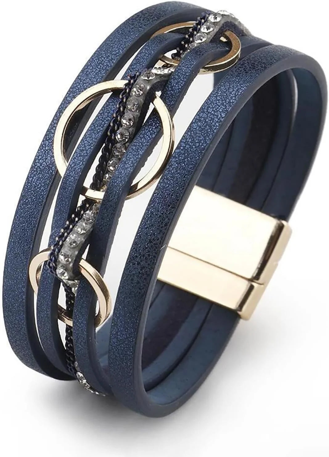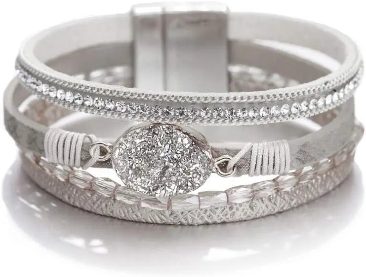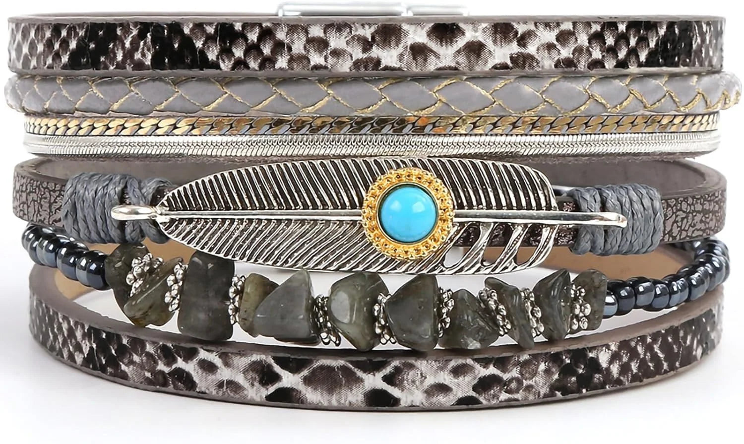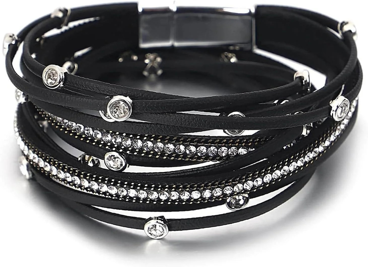 Fesciory Leopard Bracelet for Women, Boho Leather Wrap Multi-Layer Pearl Crystal Bracelet Bangle Jewelry