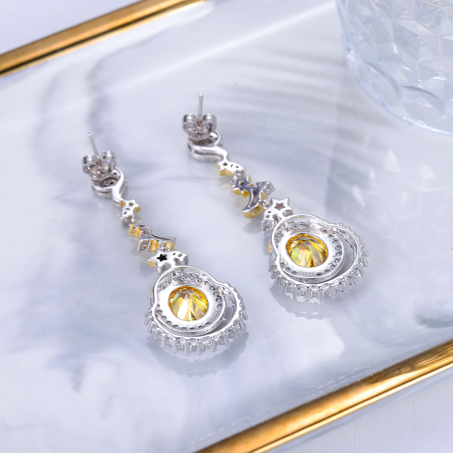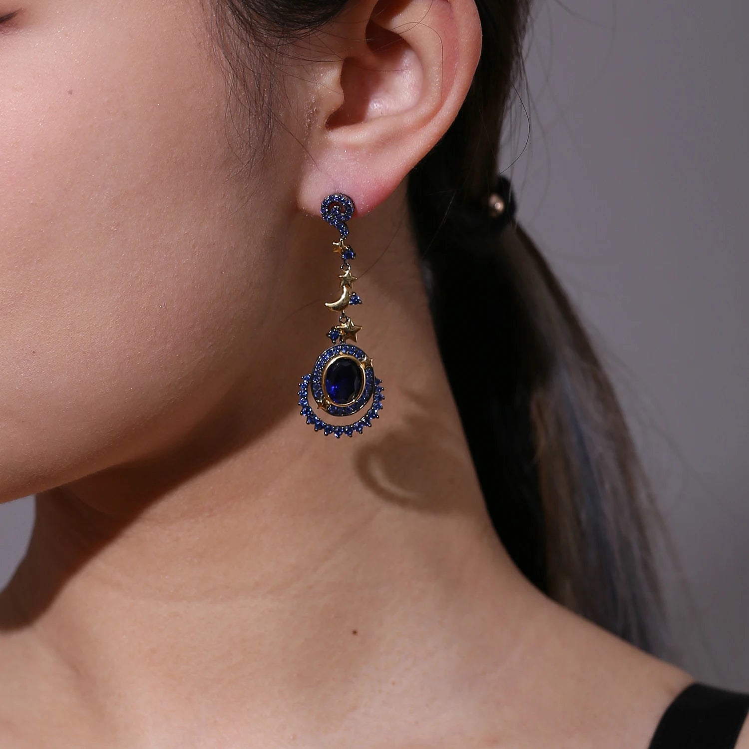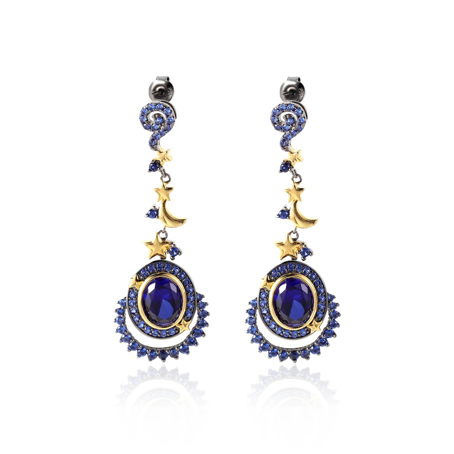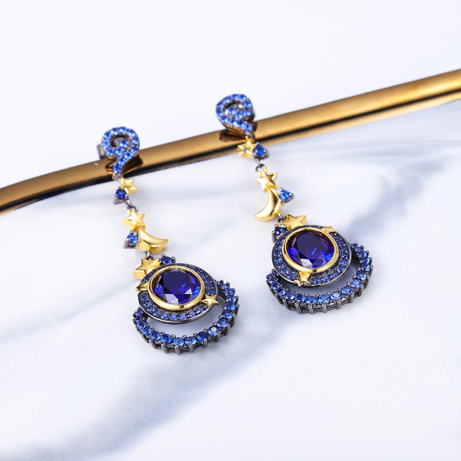 lab Blue Sapphire Vintage Earrings 925 Sterling Silver Handmade Star Moon Element Drop Earrings for Women Jewelry