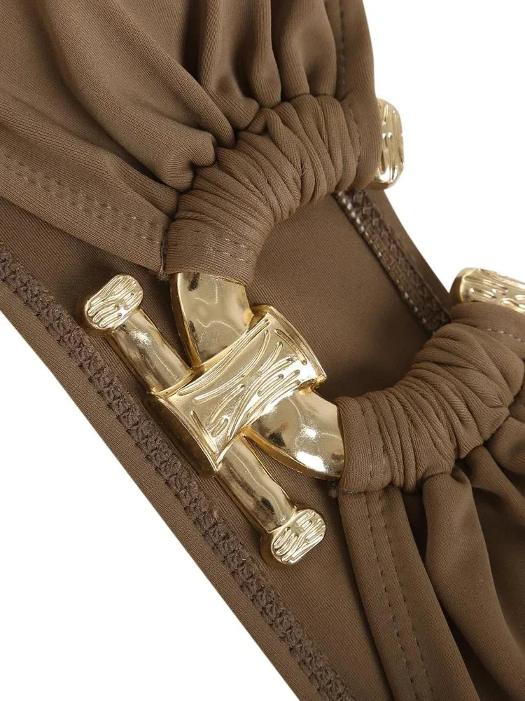 Solid O Ring 2025 New Swimsuit For Women Tie Side Shiny Metal Hardware Ring Bandeau Bikini Swimwear Padded Bra Top Low Waisted