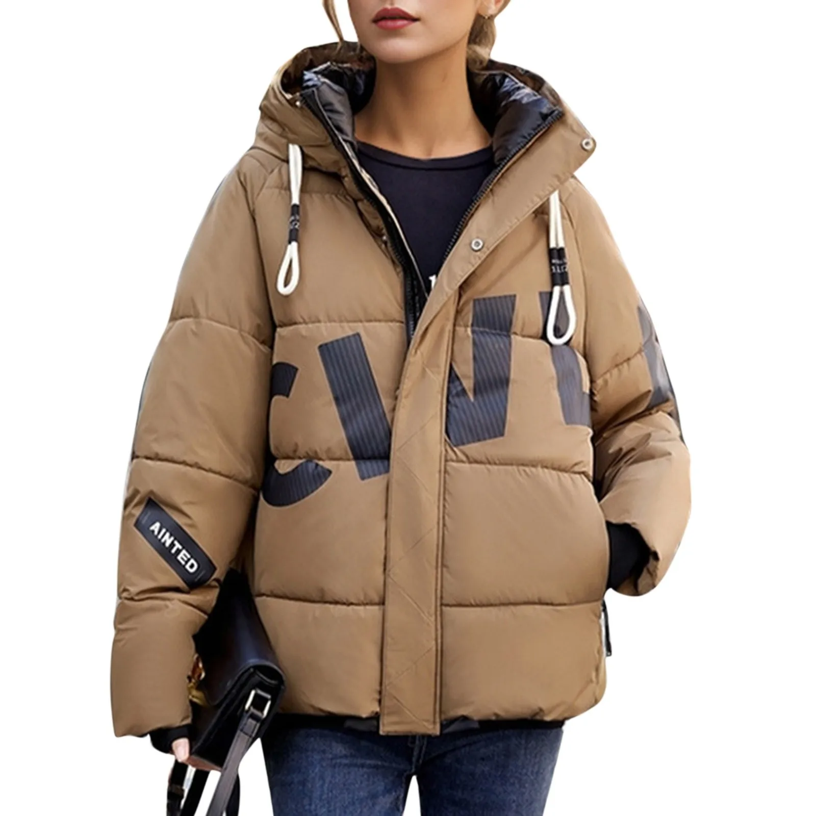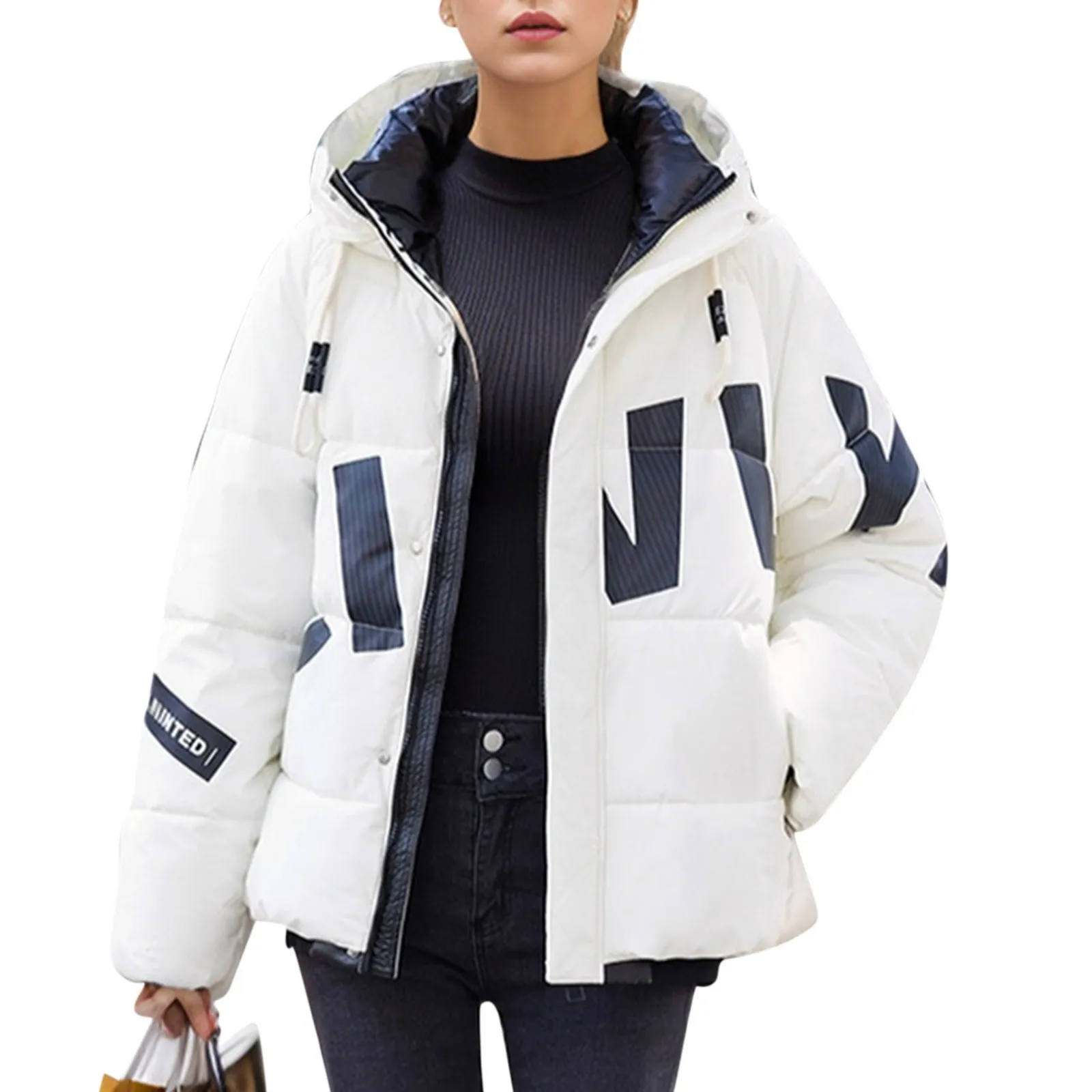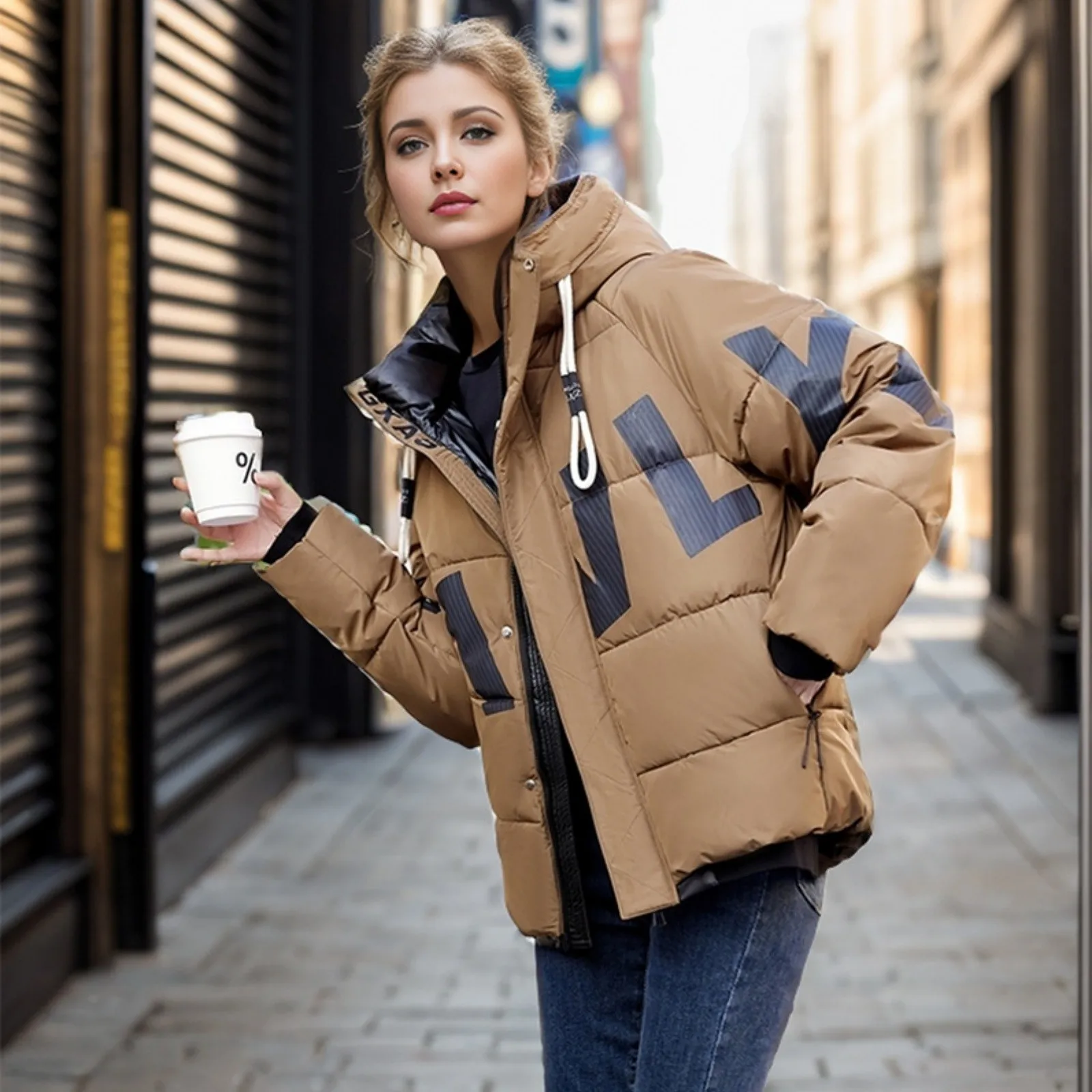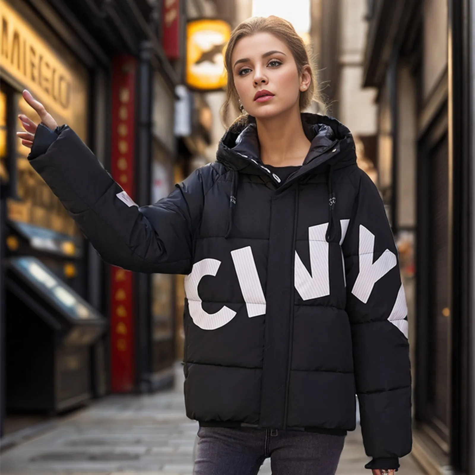 Women's Fashion Thickened Short Stamped Letter Zipper Hooded Winter Warm Cotton Coat Down Jacket