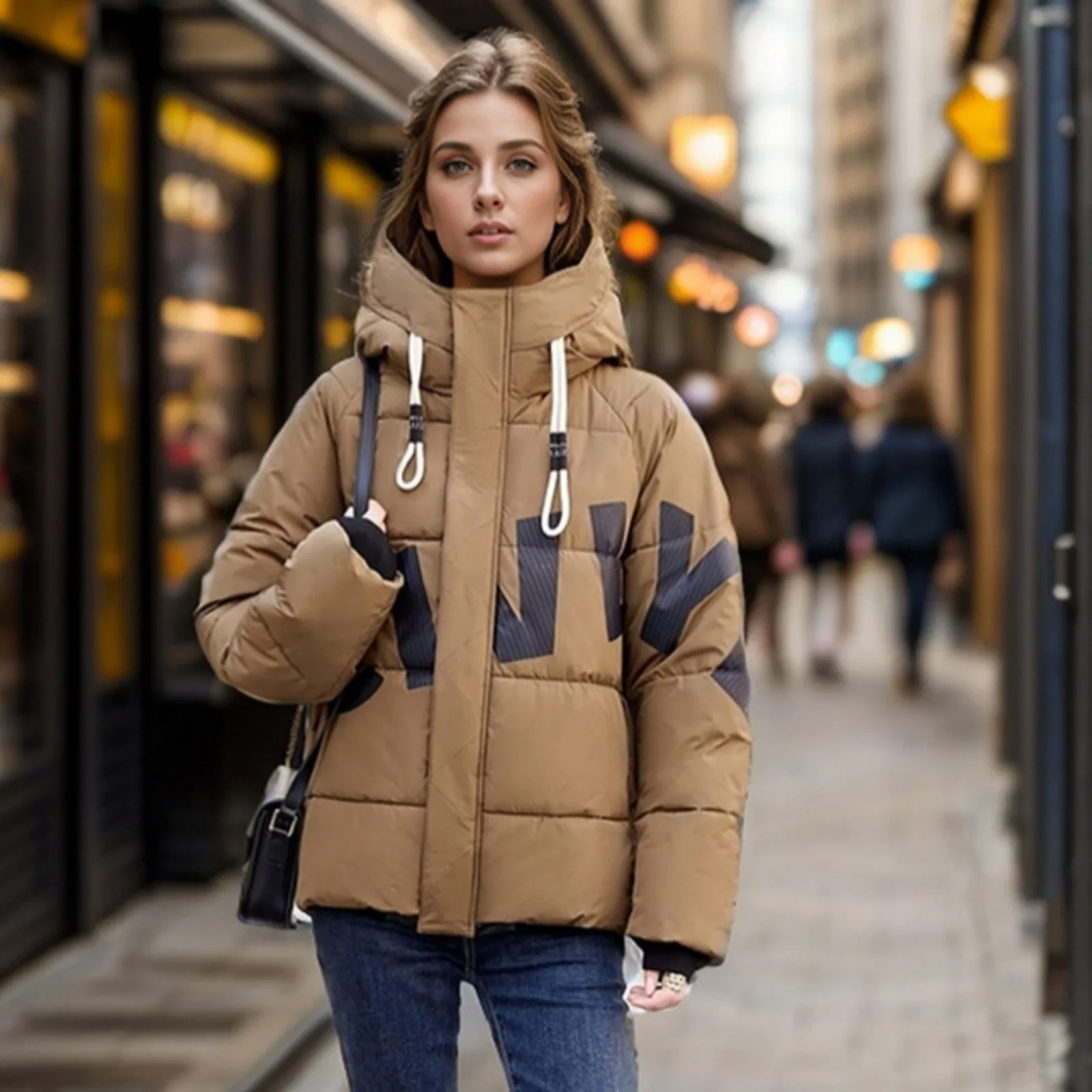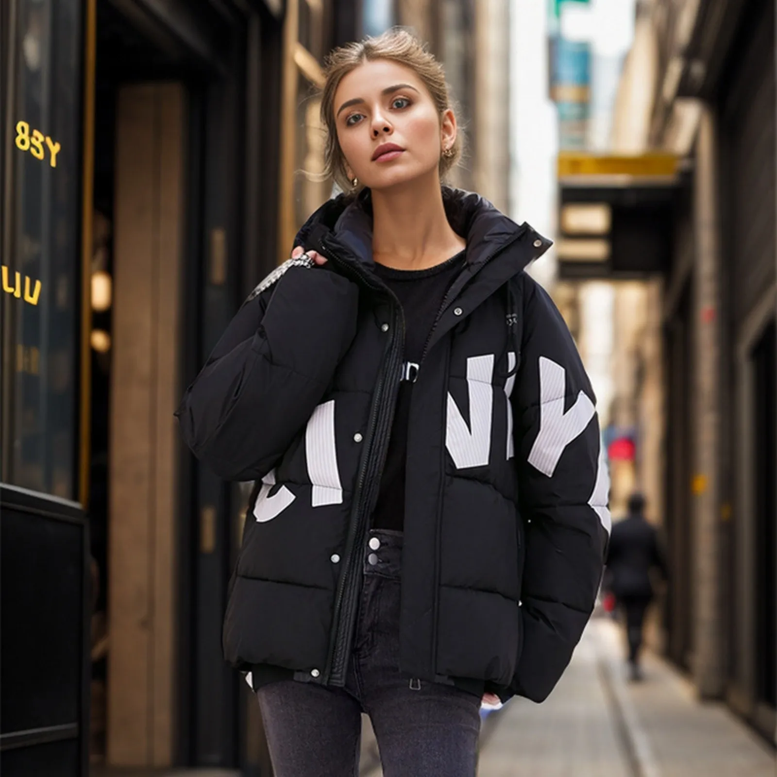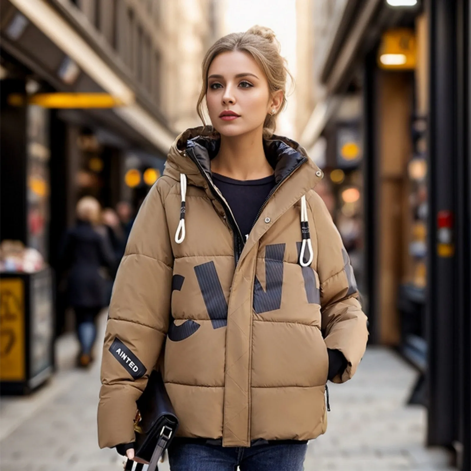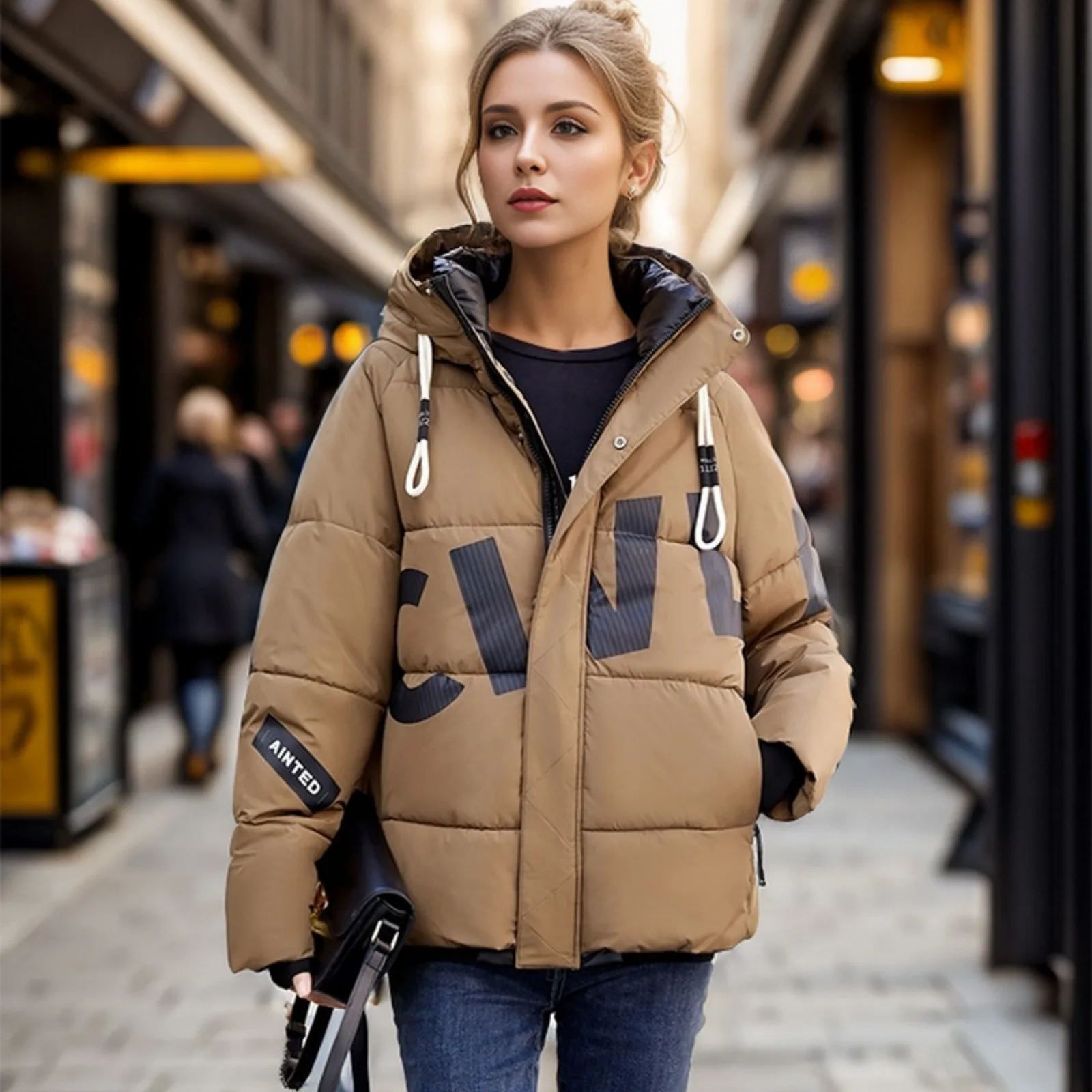 Women's Fashion Thickened Short Stamped Letter Zipper Hooded Winter Warm Cotton Coat Down Jacket