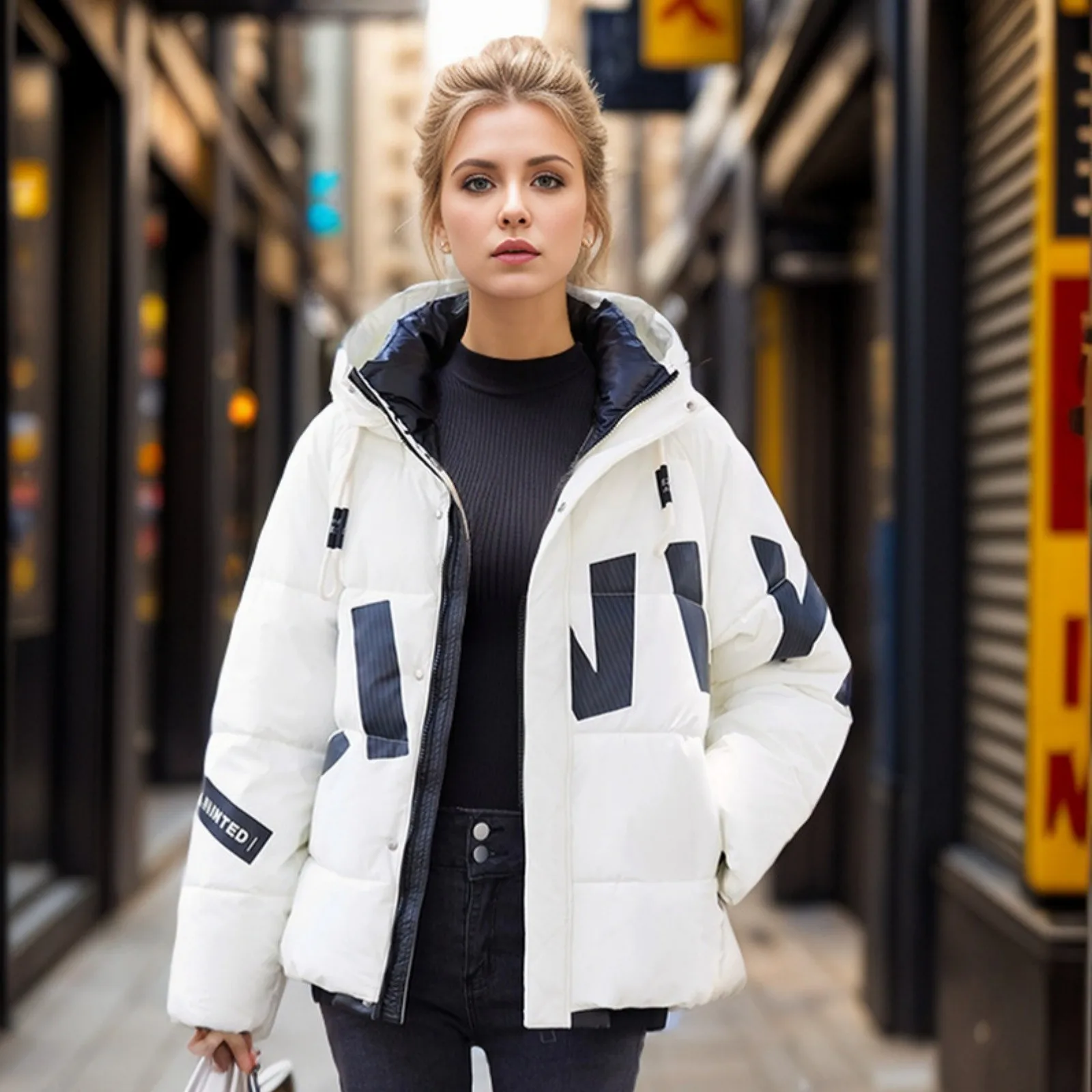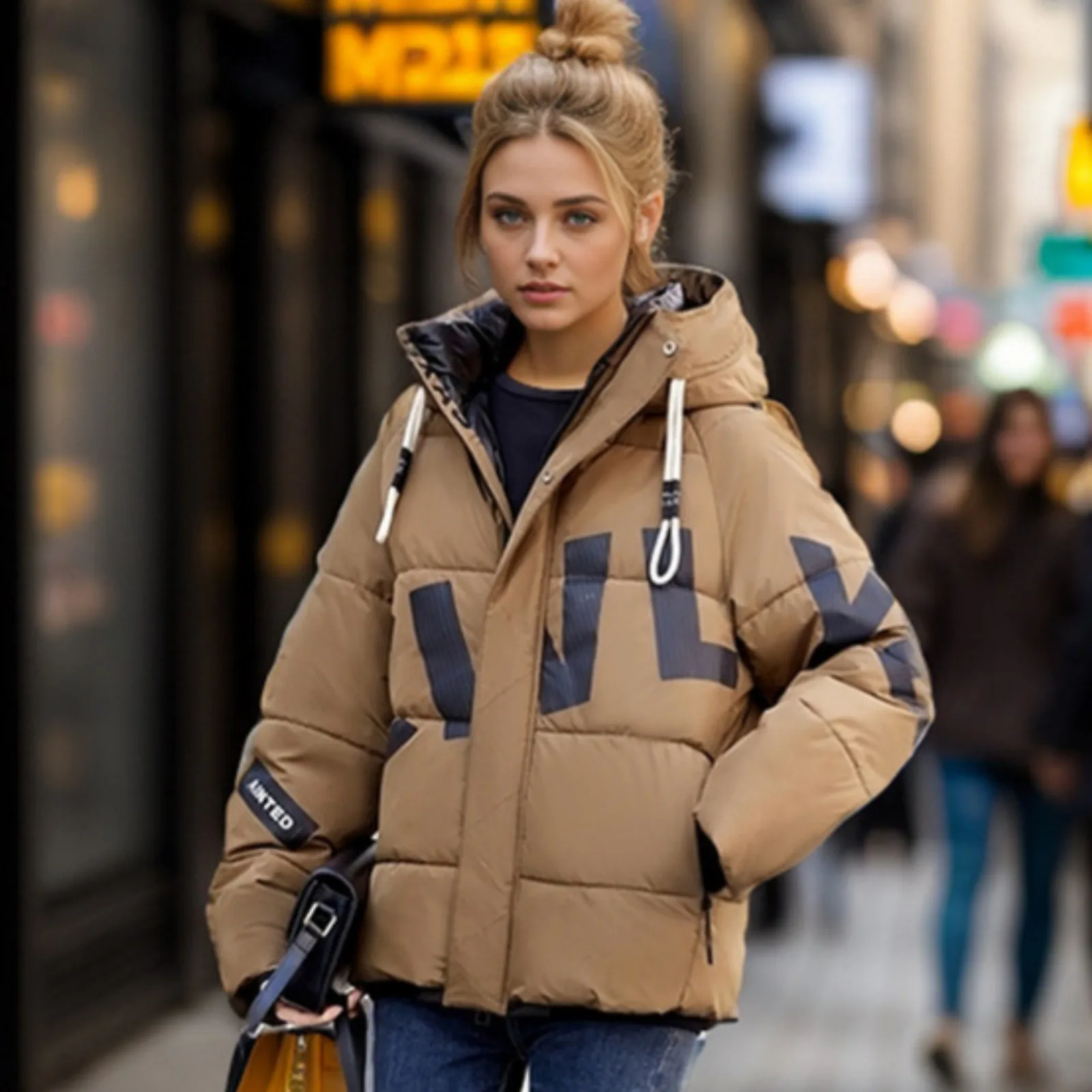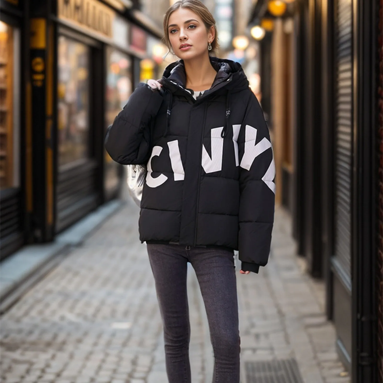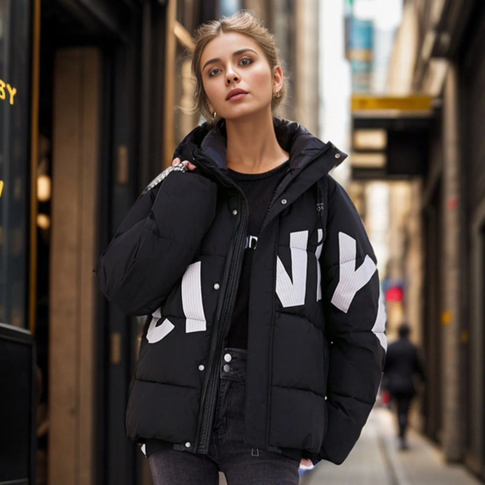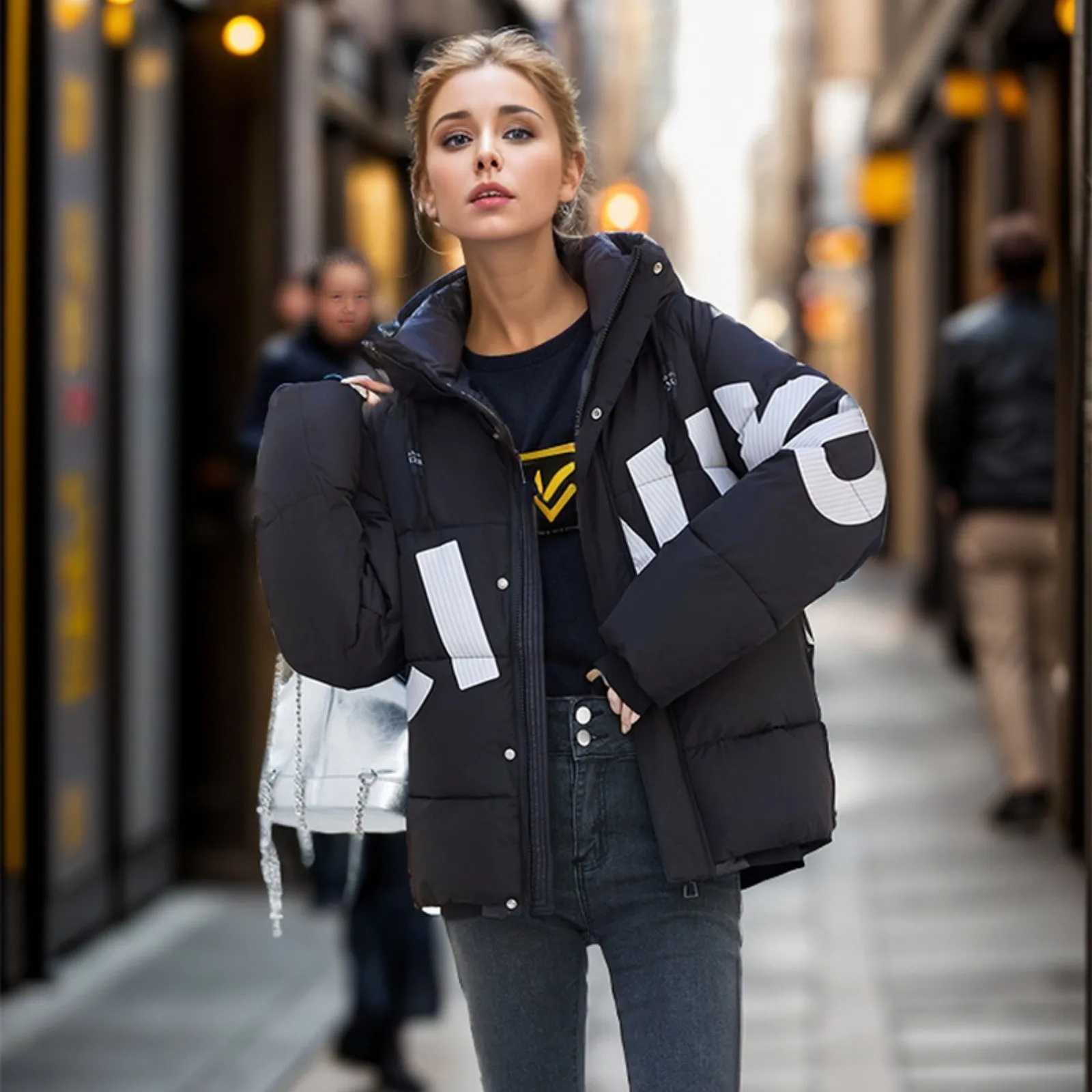 Women's Fashion Thickened Short Stamped Letter Zipper Hooded Winter Warm Cotton Coat Down Jacket