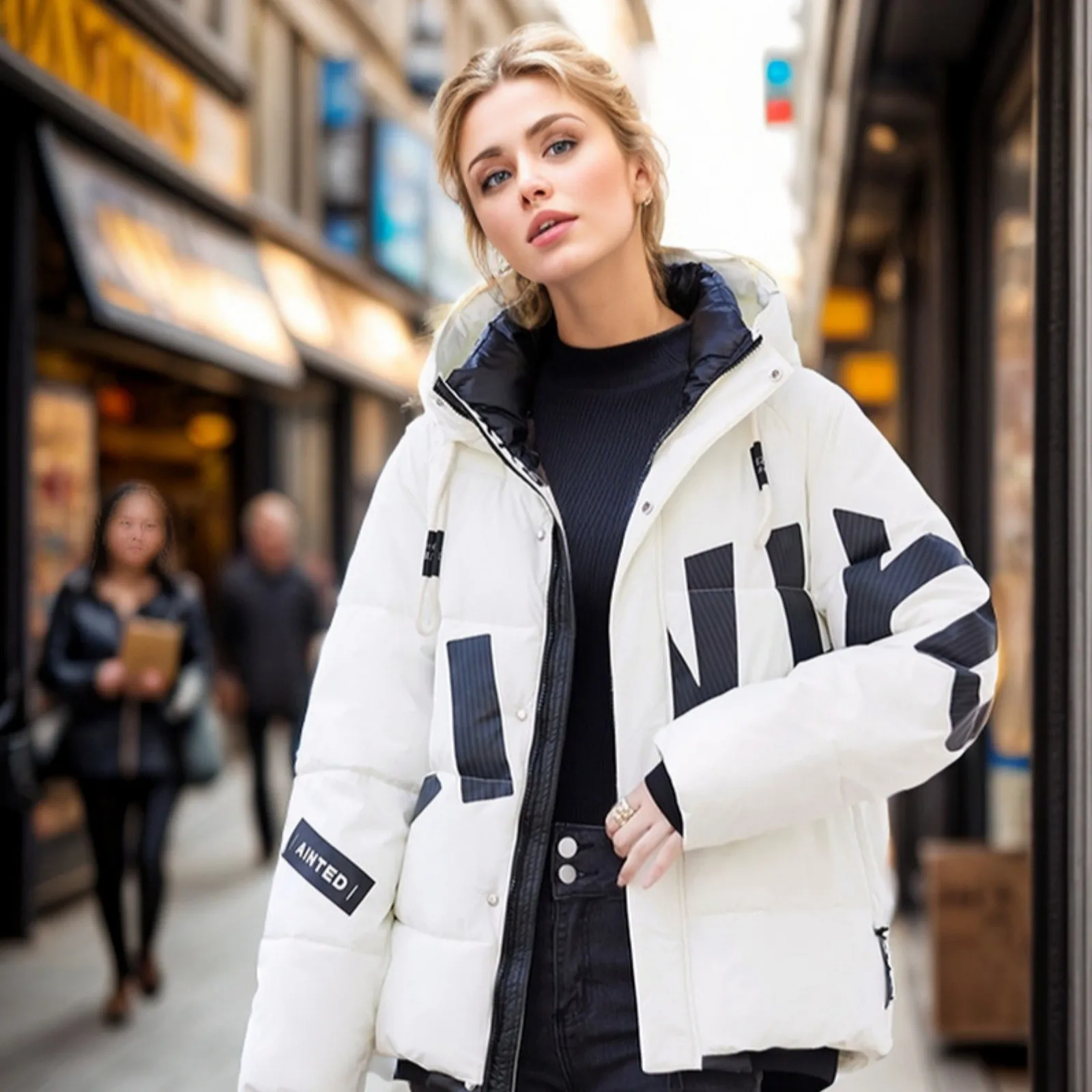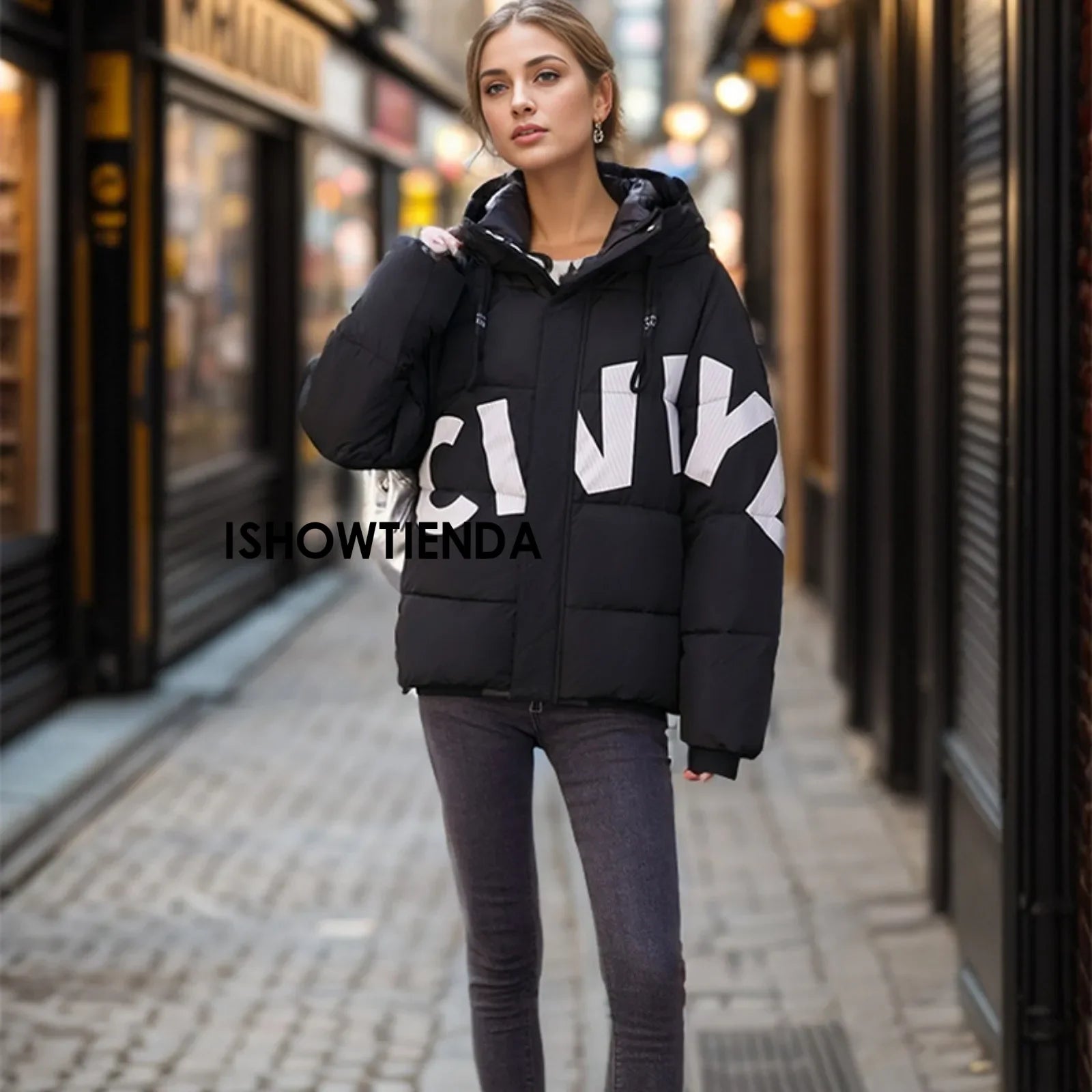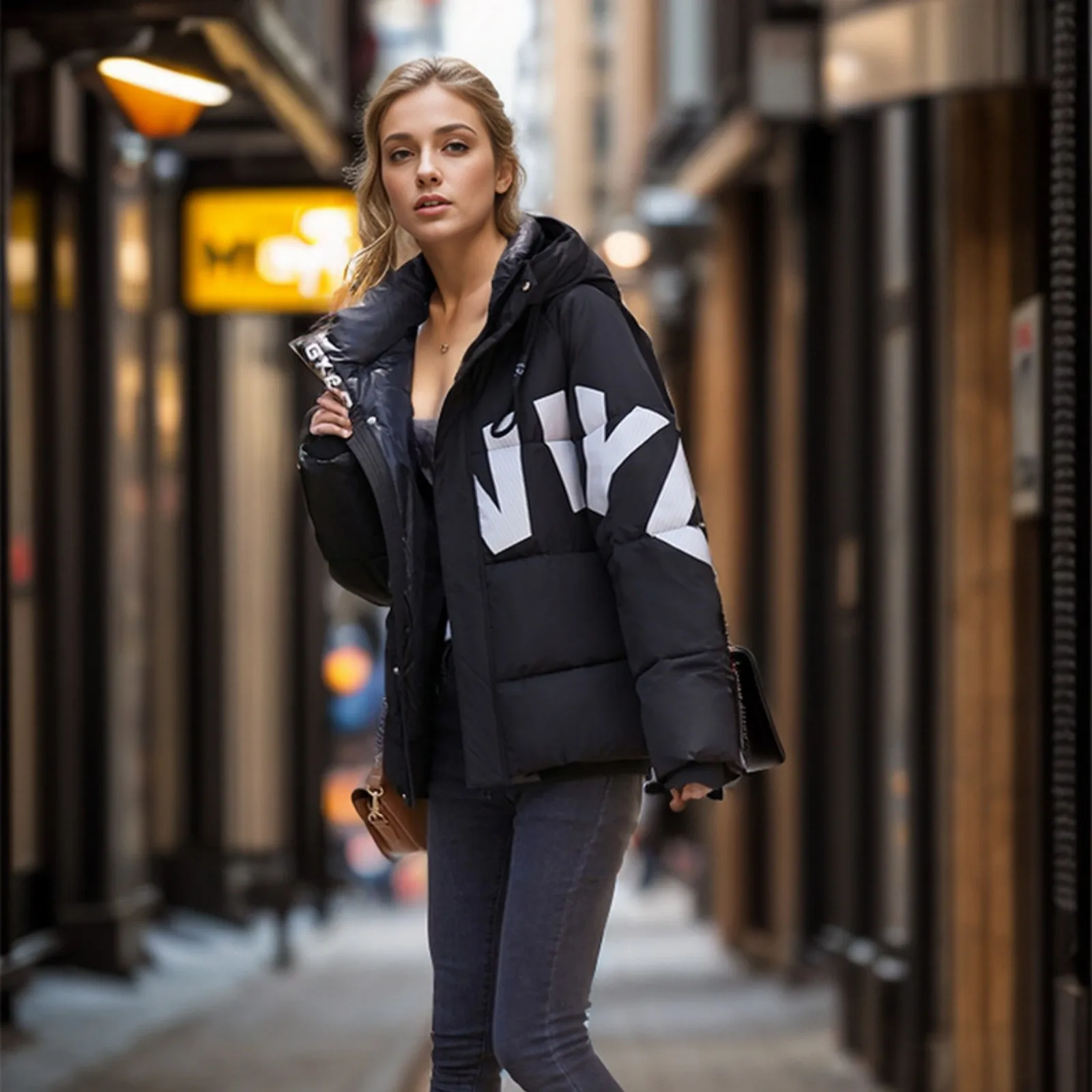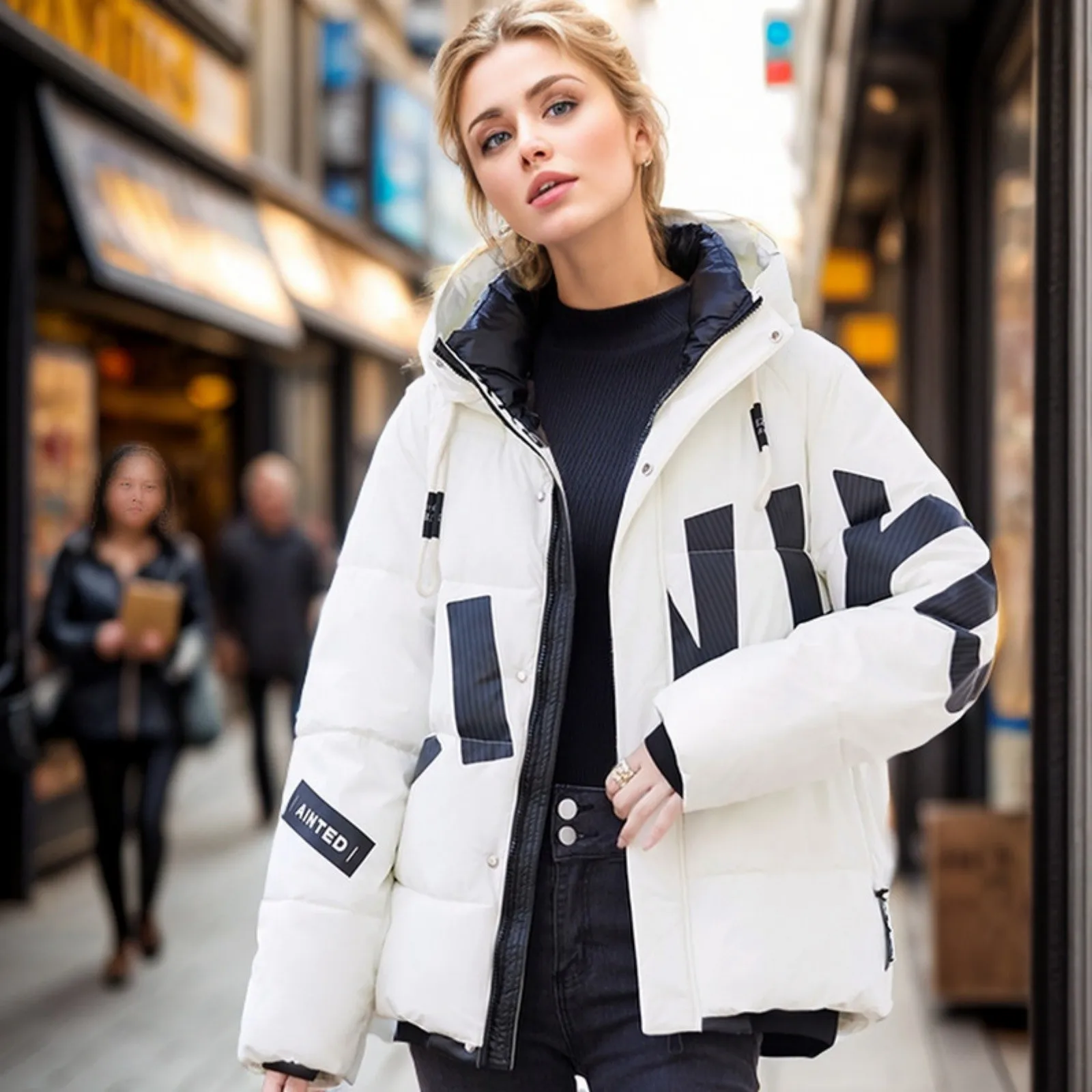 Women's Fashion Thickened Short Stamped Letter Zipper Hooded Winter Warm Cotton Coat Down Jacket