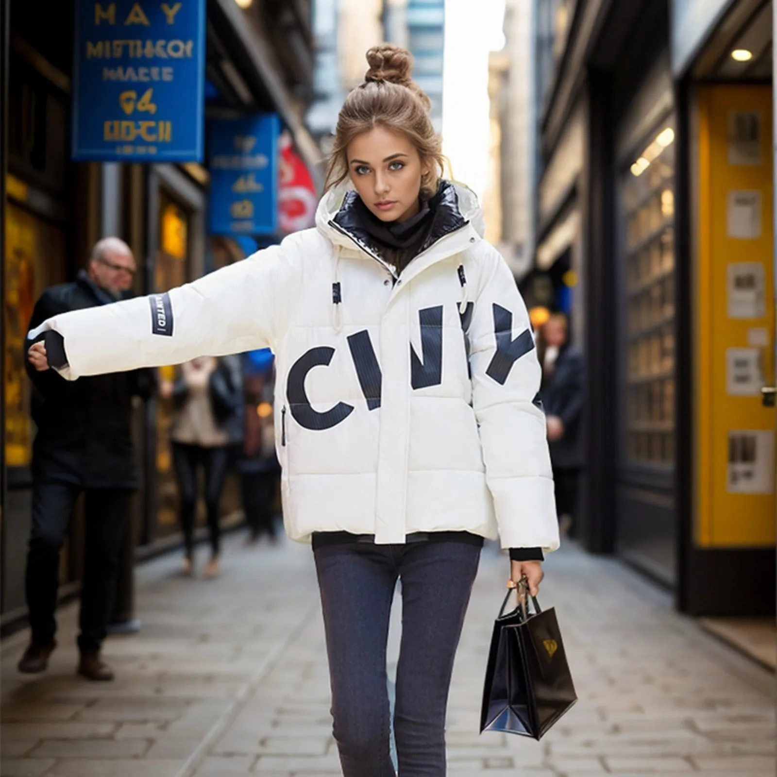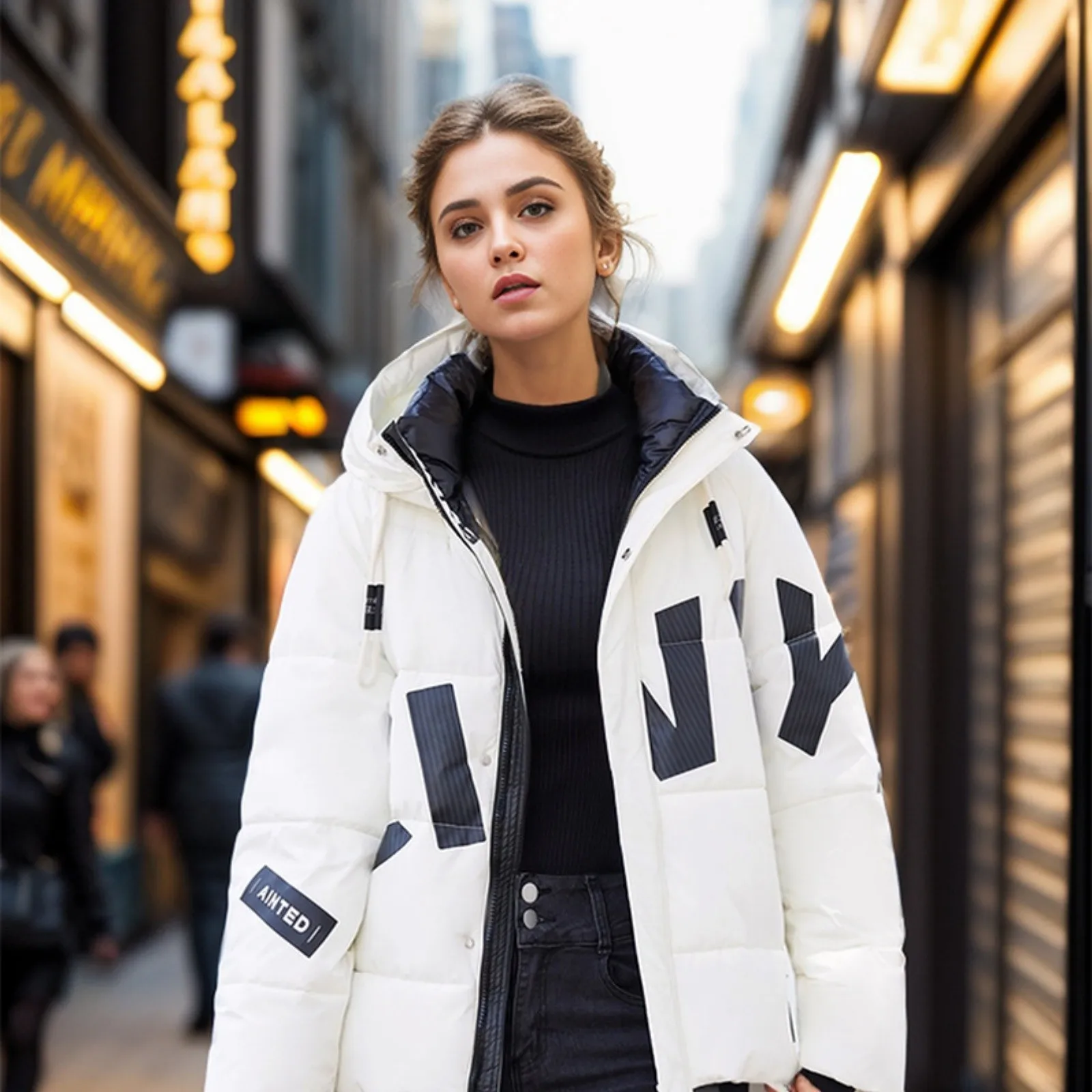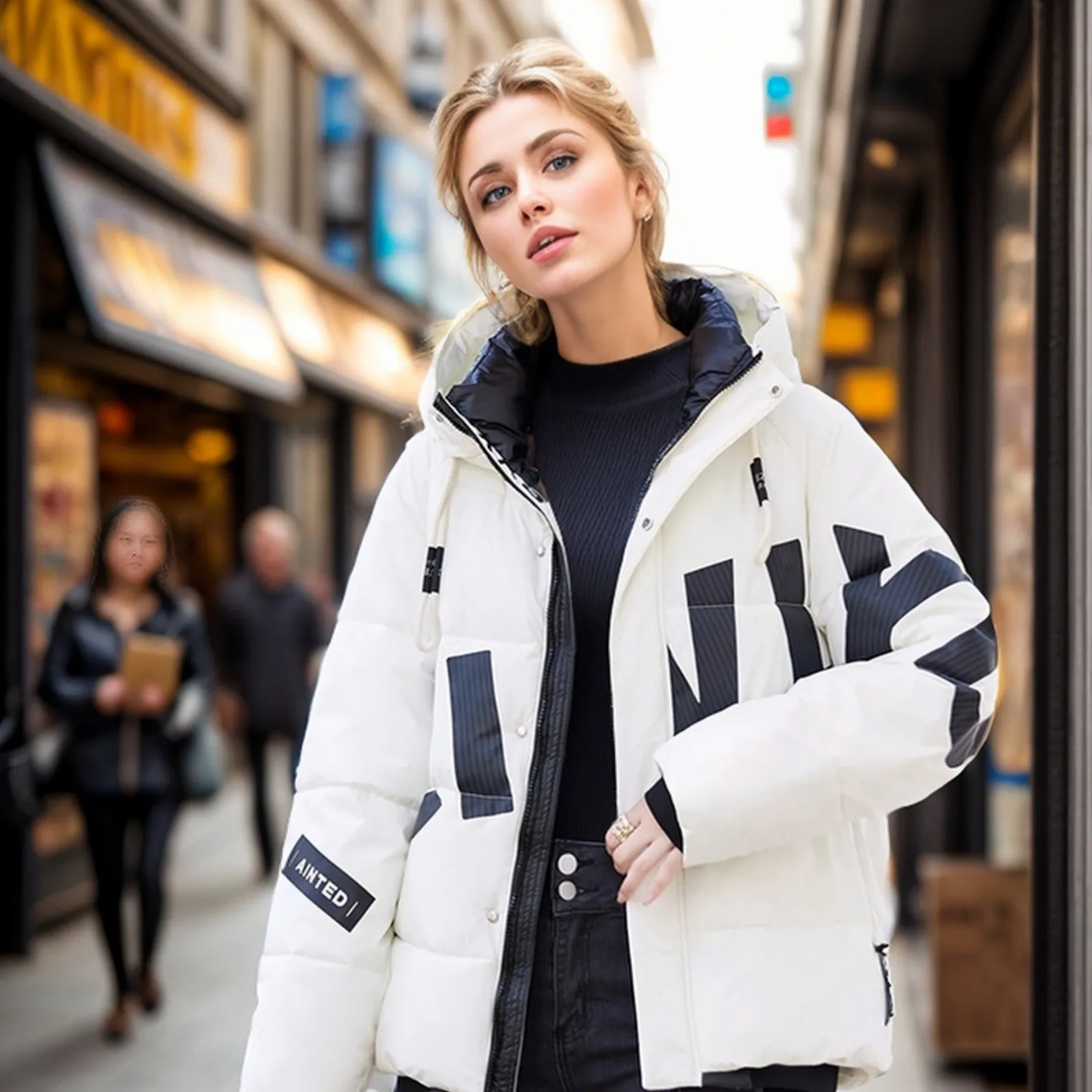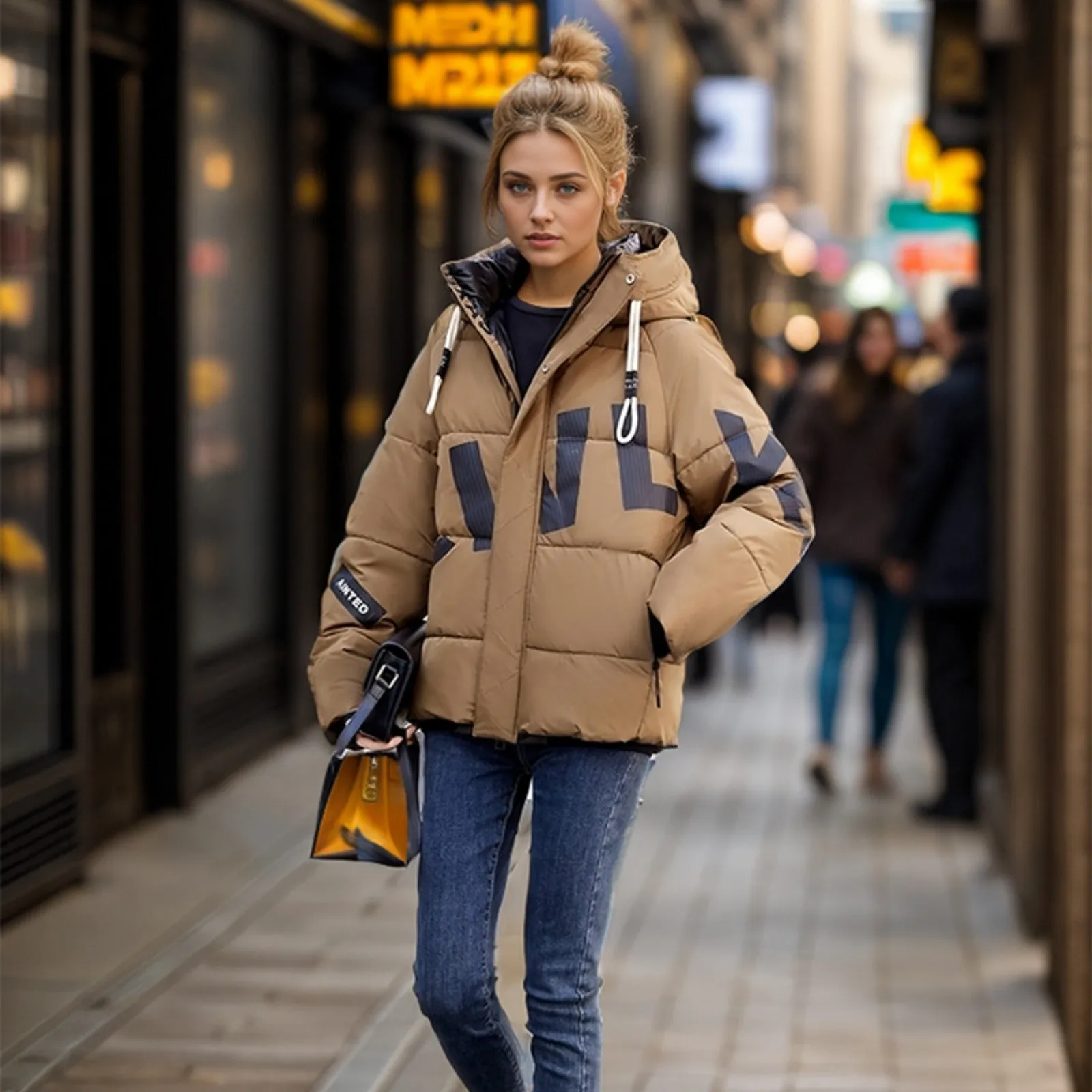 Women's Fashion Thickened Short Stamped Letter Zipper Hooded Winter Warm Cotton Coat Down Jacket