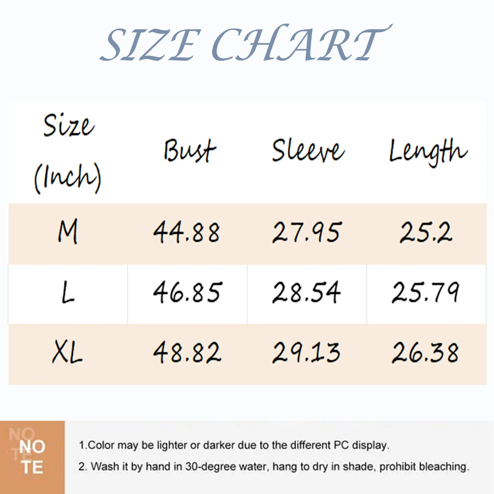 SizeBustSleeveLengthM114cm/44.88''71cm/27.95''64cm/25.20''L119cm/46.85''72.5cm/28.54''65.5cm/25.79''XL124cm/48.82''74cm/29.13''67cm/26.38''